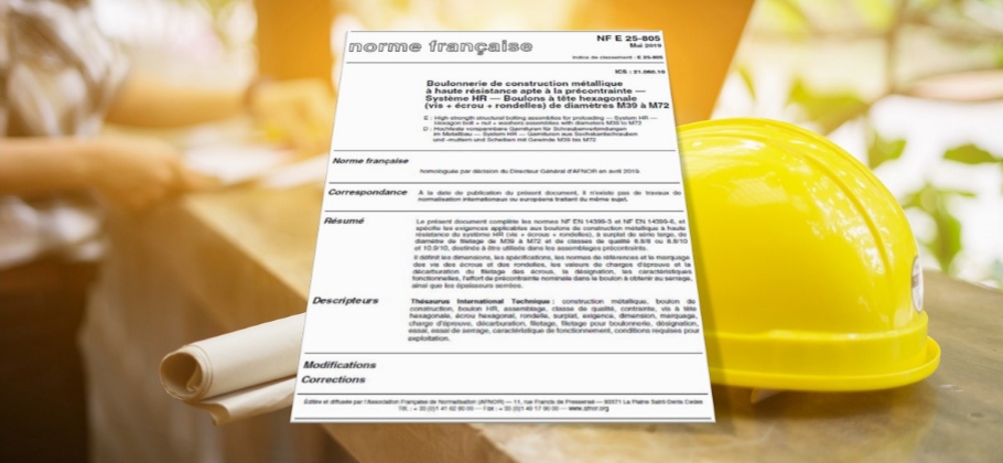 Cette norme complète les normes NF EN 14339-3 et NF EN 14399-6, et spécifie les exigences applicables aux boulons de construction métallique à haute résistance du système HR (vis + écrous + rondelles), à surplat de série large, de diamètre de filetage de M39 à M72 et de classes de qualité 8.8/8 ou 8.8/10 et 10.9/10, destinés à être utilisés dans les assemblages précontraints.